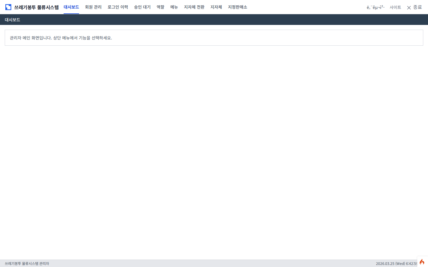공개: 홈, 로그인, 회원가입 관리자: 대시보드, 회원관리, 로그인이력, 승인, 역할, 메뉴, 지자체, 지정판매소 사용자: 대시보드 4종, 재고조회, 수불현황 Co-Authored-By: Claude Opus 4.6 (1M context) <noreply@anthropic.com>